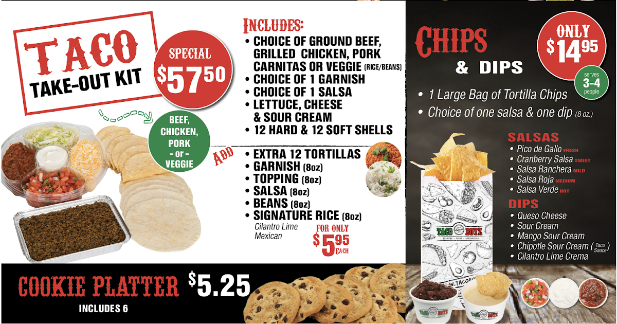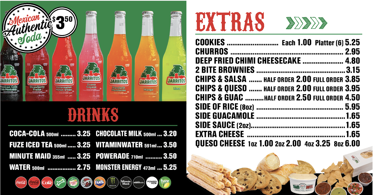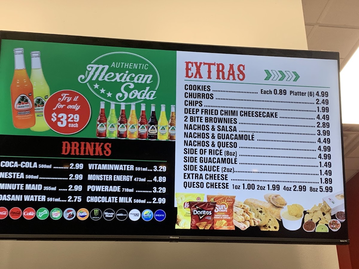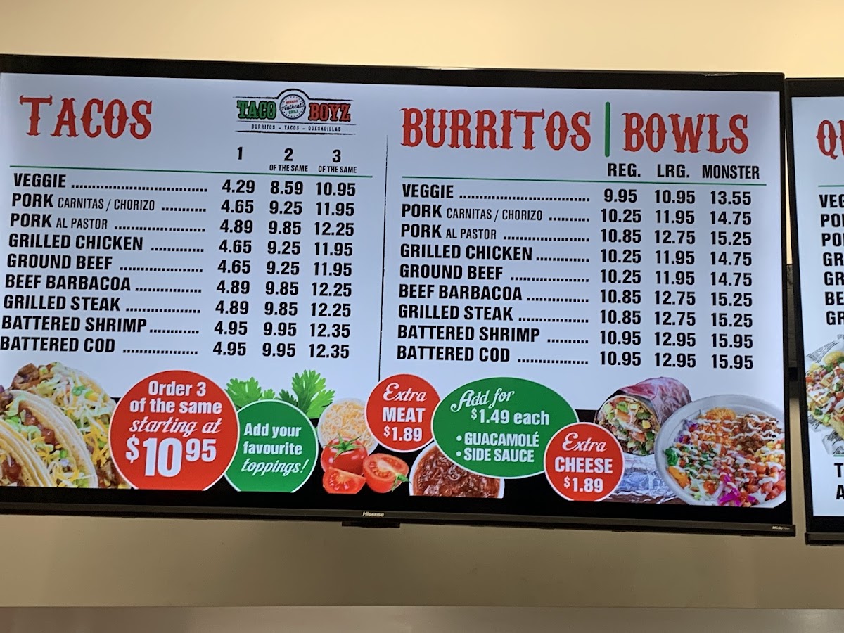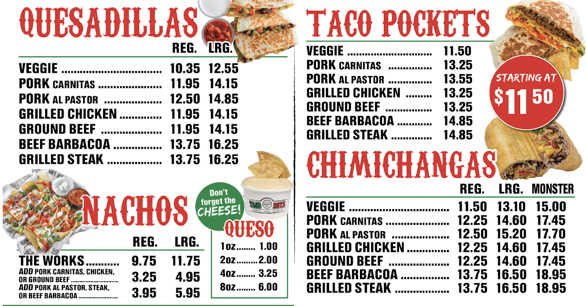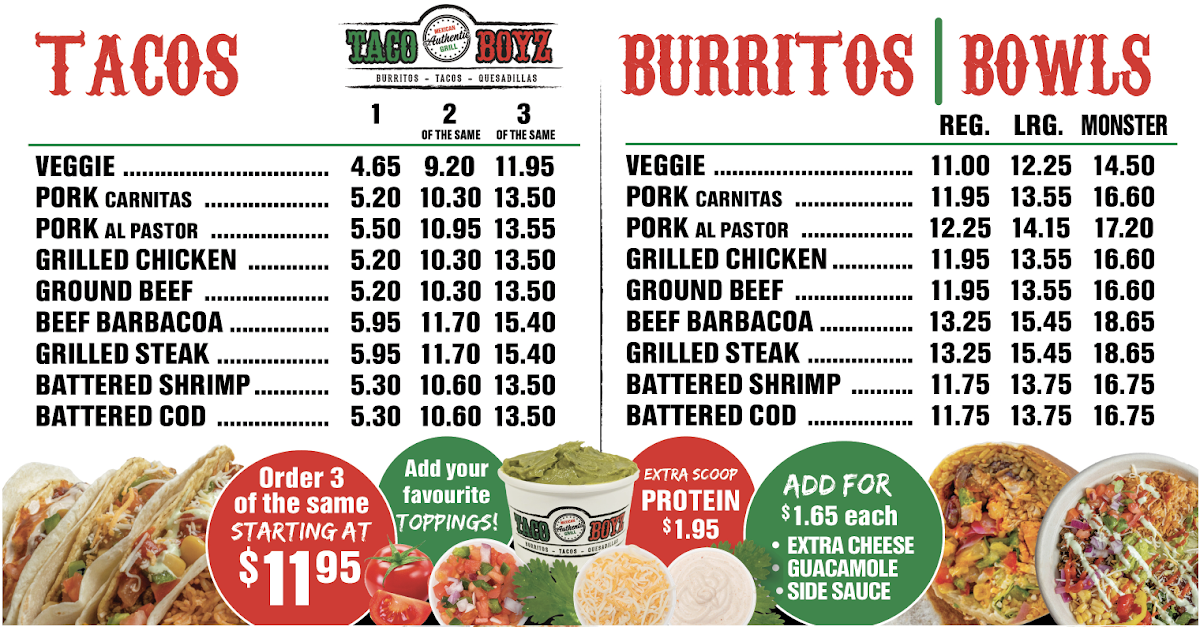 Overall, the menu at Taco Boyz (Saint John East Point) keeps things simple yet satisfying, focusing on classic Mexican-inspired staples that cover all the essentials. From the customizable Tacos to hearty options like the Burrito and bowl selections under Burritos/Bowls, there’s something for both quick bites and filling meals. The Quesadilla offers a comforting, cheesy option, while the Taco Pocket adds a slightly different twist for those looking to try something new. For sharing or indulgence, the Nachos stand out as a go-to choice, and the crispy, flavorful Chimichanga rounds out the savory offerings nicely. On the sweeter side, extras like Churros, Cookies, and Chips provide a simple but welcome finish. While pricing isn’t specified, the menu’s straightforward structure and familiar dish lineup make it approachable and easy to navigate for a casual dining experience.