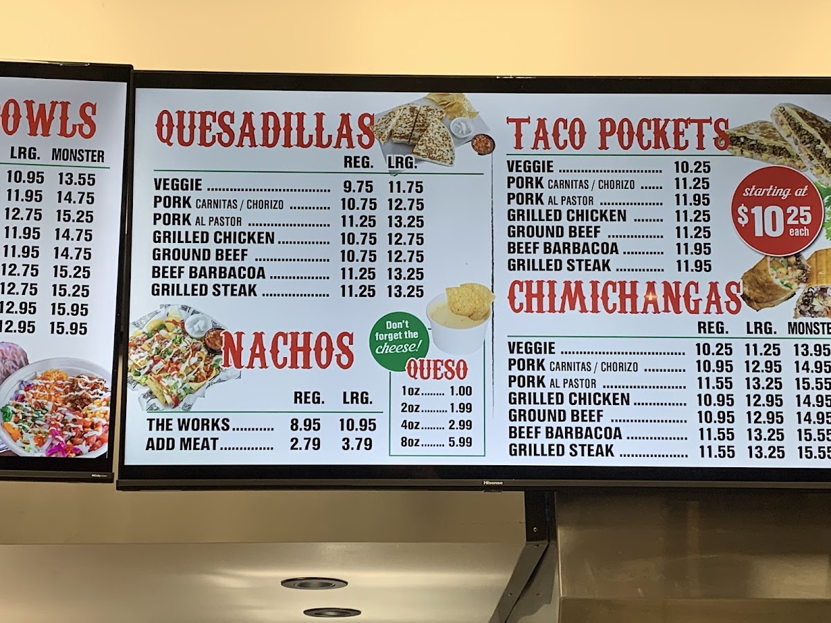Our burritos & burrito bowls come in sizes Regular, Large, & our famous MONSTER size! MEAT OPTIONS: Original Chicken, Sweet Chilli Chicken, Butter Chicken, Ground Beef, Pulled Pork, Steak, Fish, Surf-n-Turf, & Shrimp